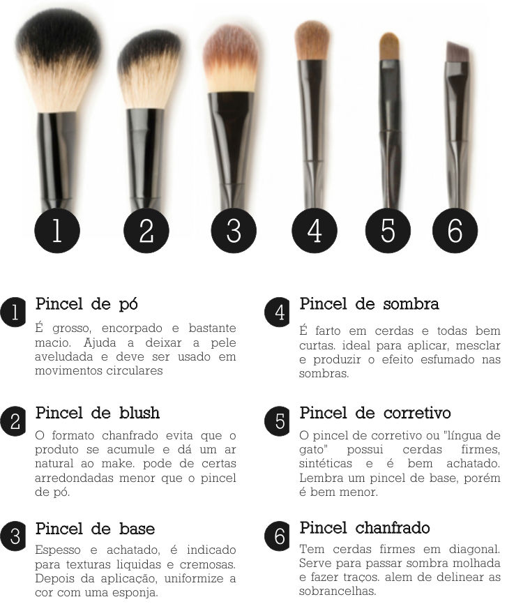 Para quem não possui o abito de se maquiar e fica na duvida de como utilizar cada pincel acredito que essa imagem mostra os mais básicos e utilizados deles. Espero que ajude.